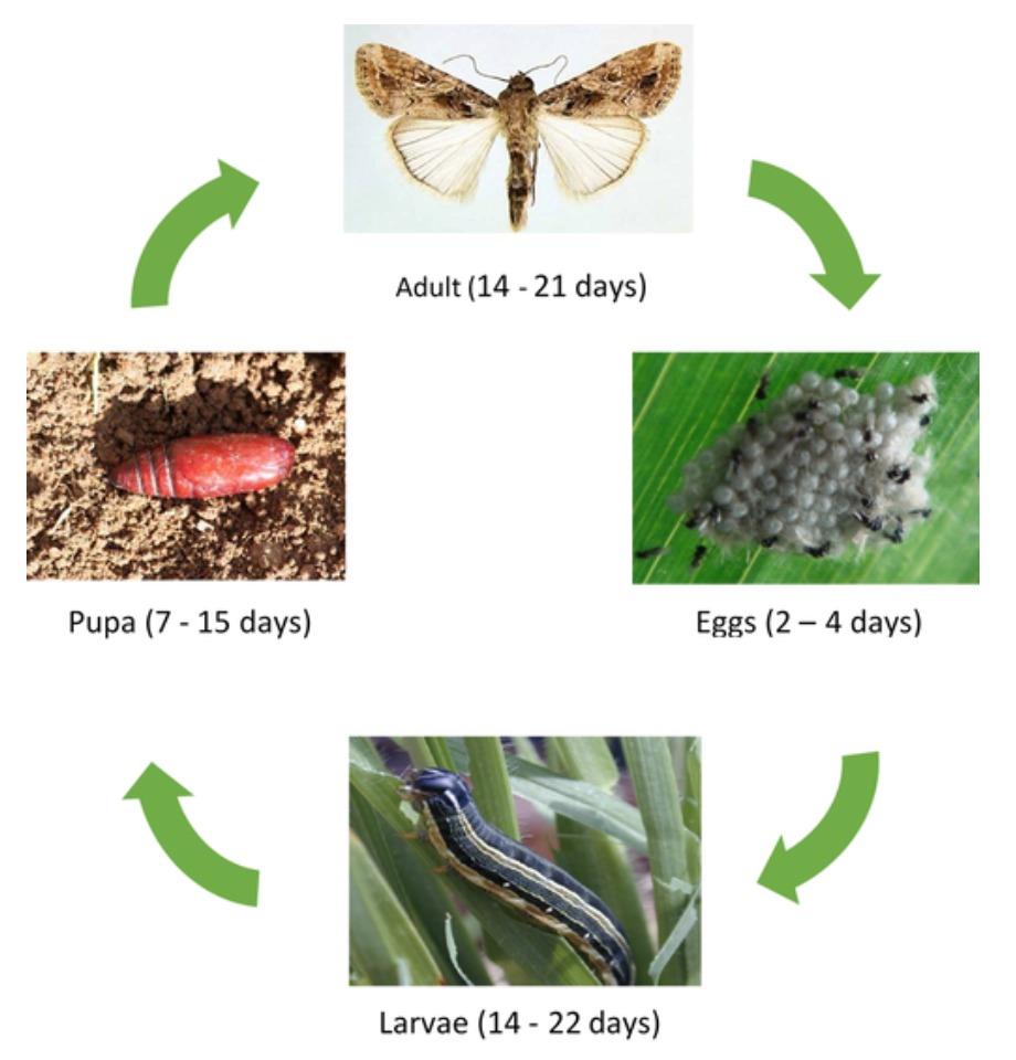The African armyworm (Spodoptera exempta)is a migratory pest whose larvae devastates graminaceous plants thus can lead to 100% crop loss in most cereals and pasture. The pest undergoes rapid development completing the life cycle within 4-8 weeks under favourable weather conditions. Eggs take less than a week to hatch, larvae undergo 6 moulting stages in 2-3 weeks and pupa stage takes 1-2 weeks to produce migratory moths. Moths can migrate hundreds of kilometres aided by wind. The pest has a high reproductive capacity where a female moth can lay hundreds of eggs during its lifecycle. African armyworm outbreaks can go unnoticed since early-instar larvae are difficult to detect. In each generation of African armyworm, there is usually only a 2-3 weeks window for effective management of larvae. The pest therefore poses a serious threat to food and nutrition security.